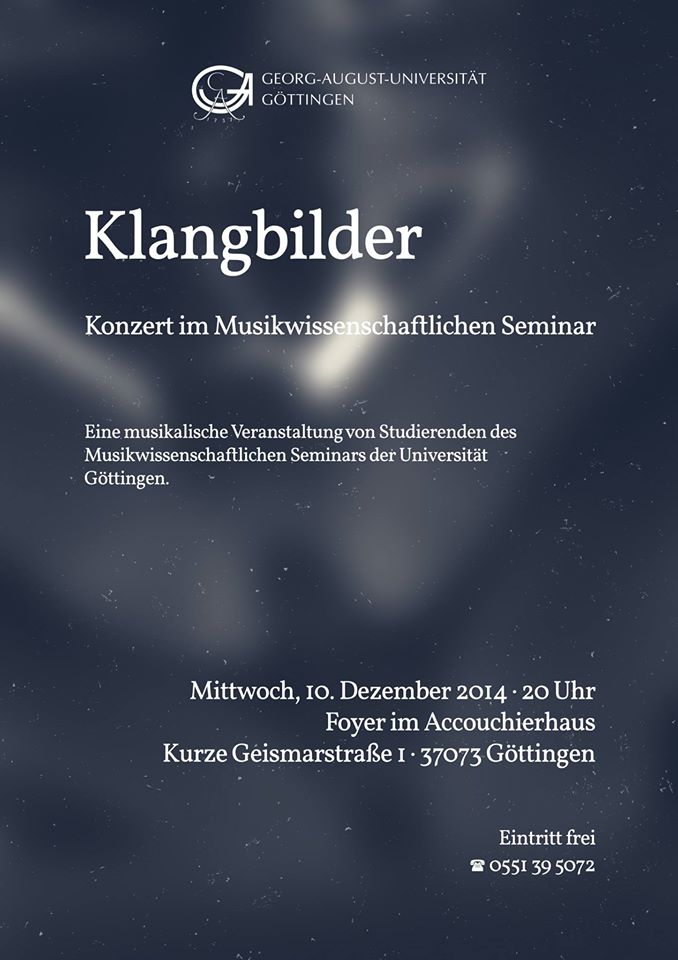 Konzerte am Musikwissenschaftlichen Seminar Klangbilder concert online, 17th Dec 2021 Klangbilder-Konzert online 14.12.2020 Klangbilder-Konzert 11.12.2019 Klangbilder-Konzert 17.12.2018 Klangbilder-Konzert 13.12.2017 Improvisationen im Accouchierhaus: 29.11.2017 Klangbilder-Konzert 8.12.2016 Klangbilder-Konzert 10.12.2015 Klangbilder-Konzert am 10.12.2014 (pdf.) Vokalensemble Ars Nova Trajectina (NL) unter der Leitung von Paul Bocken singt Renaissancewerke von Josquin Desprez und Jean Mouton, 15.2.2014 (.pdf) Cafe Mozart Klangbilder-Konzert am 11.12.2013 (pdf.) Klangbilder-Konzert am 15.12.2010 Konzert der Donald Kachambals Kwela Heritage Jazzband des Oral Literature Research Programme, Chileka, Malawi, 3.2.2010 Klangbilder-Konzert am 12.12.2007 (pdf.) Klangbilder-Konzert am 6.12.2006 (pdf.) Musica Viva: Neue Musik an der Universität Göttingen